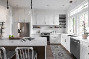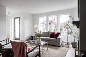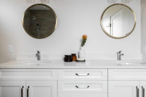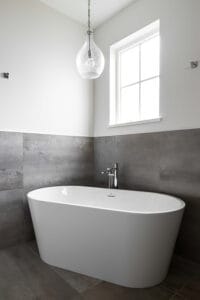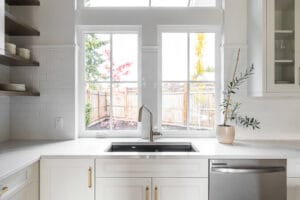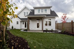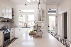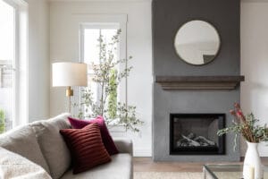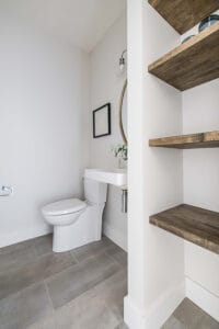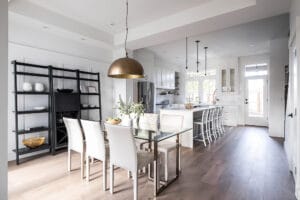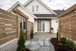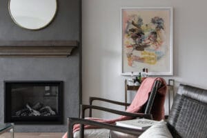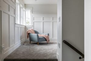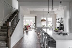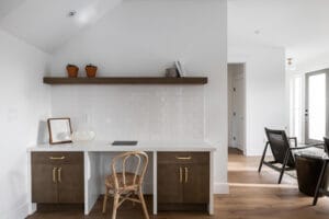 This was a really interesting project, notably because of the challenges it offered. The site was triangle shaped and on a busy street. It lacked a neighbourhood feel and the best sun, and the most rational outdoor space was in the front yard. We were able to design a house to take advantage of this southwest front yard, creating a courtyard with concrete wall structures and orienting if for outdoor living. This solved the problem of the lack of neighbourhood feel by creating a private escape. The interiors were upscale, but still intimate. Attention to detail was key: the kitchen window extends to the countertop, detail within the porcelain bullnose and mitered corners on the backsplash, as well as the wainscotting and custom newel post. It was a really interesting project!