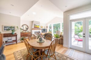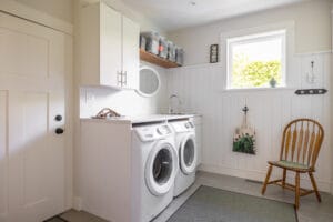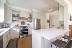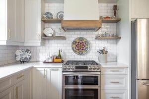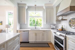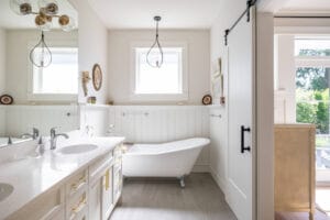 The aesthetic on this project was a vintage beach house with understated elegance. We achieved this through the use of wood, simple beadwork and vintage inspired lighting. We were also able to design a layout that facilitated a communal atmosphere, offered good connection to the gardens, but also intimate spaces, such as a tucked away wet bar/prep area in the kitchen, and luxurious primary bath with cast-iron soaker tub, which ultimately made the house approachable, comfortable and liveable.
